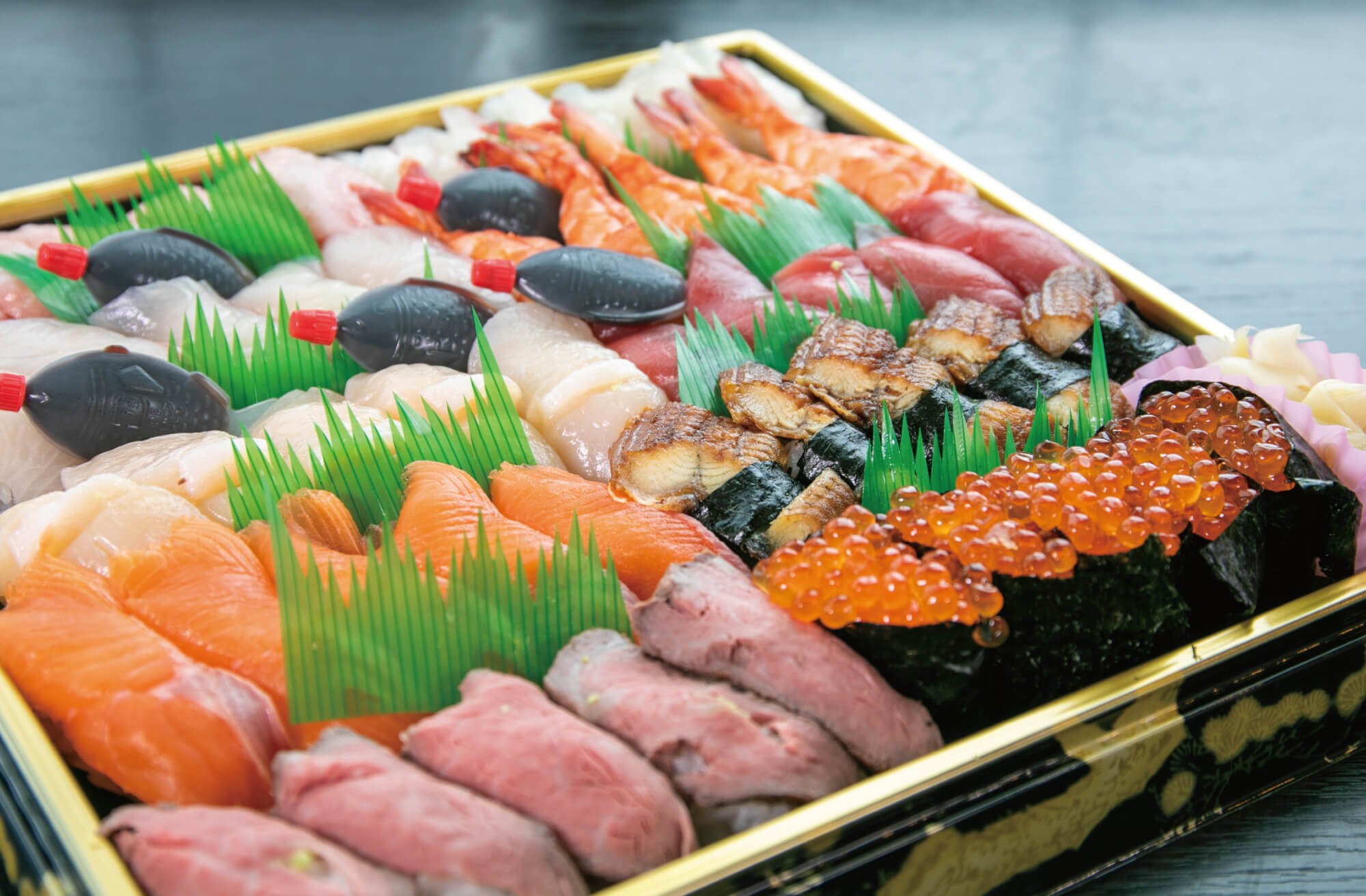 鮮魚と自家製近江牛ローストビーフの握りを詰め合わせた、番野一番人気の一品。